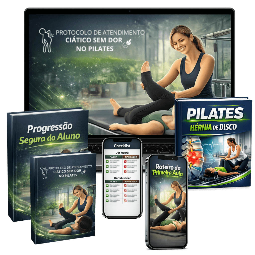 Um protocolo completo e pronto para atender alunos com dor ciática no Pilates. Você saberá o que fazer e o que evitar, sem improviso de exercícios e sem medo de piorar a dor.